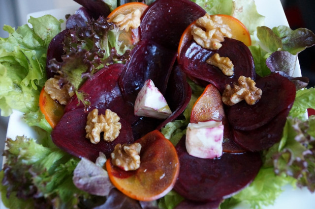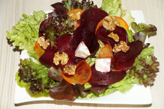 ![]() Увидев вот такую красоту в одном из журналов – просто не могла пройти мимо. А так как там было только фото – то составила свой способ приготовления. ![]() У меня, не так красиво получилось как на картинке (и если честно, не добивалась сходства и фотографировала уже в сумерках), но получилось однозначно очень вкусно! А сочетание «свекла – хурма», вообще здорово. Готовить этот салат можно как с вареной свеклы, замороженной, так и со свежей. Но советую, и вареную свеклу предварительно мариновать в дрессинге из масла и бальзамического уксуса (или фруктового уксуса), положить в фольгу и запечь открытой, чтобы она немного подсушилась. Еще как вариант, если делаете с вареной свеклой, то часть можно измельчить в блендере с растительным маслом – получится как «свекольное песто» и это песто можно тоже разложить на листья салата. Свежую свеклу нужно натерать тонкими слайдами на терке, тогда она быстрее приготовится в духовке. Сыр - можно брать любой мягкий сыр, на ваш вкус: начиная с творога, творожной массы, моцареллы и заканчивая сырами с плесенью. Такие сыры хорошо сочетаются с грецкими орехами. Cкрытый текст - Cкрытый текст - Настроение сегодняшнему дню задает: