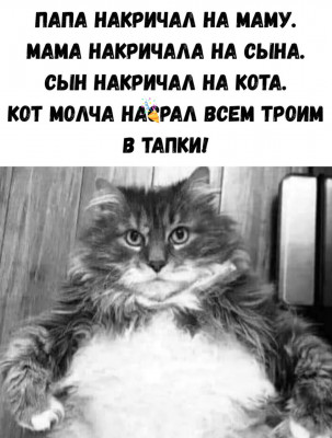 ![]() пишу в личку коту Сёмке - твой хозяин уже задолбал всех по окружности теперь бессловесных принялся долбать в смеховой теме про котяр что смешного в фото котяры - ну любишь ты его - ну и люби в себя хотя хочется пощупать кадык у обоих на предмет хрупкости мы не будем молчать - мы восстанем и будем клеймить в морду по рылу хотя только в личку |