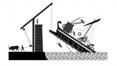 Крюк под названьем "Архимеда лапа" Был создан для защиты Сиракуз. Сей кран за нос корабль римский цапал, Таща на дно трирем, людей, и груз. Cкрытый текст - |
