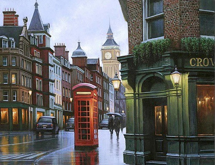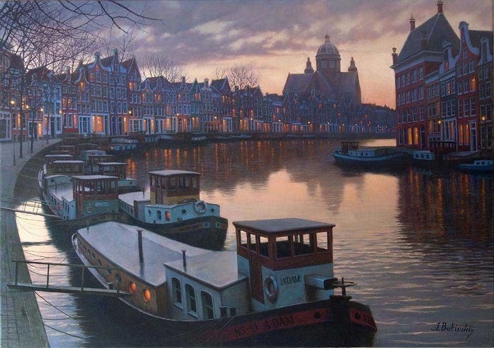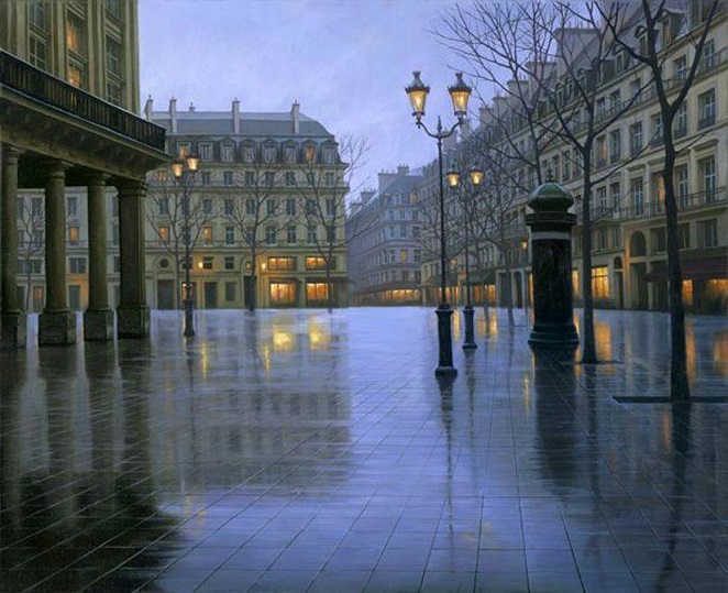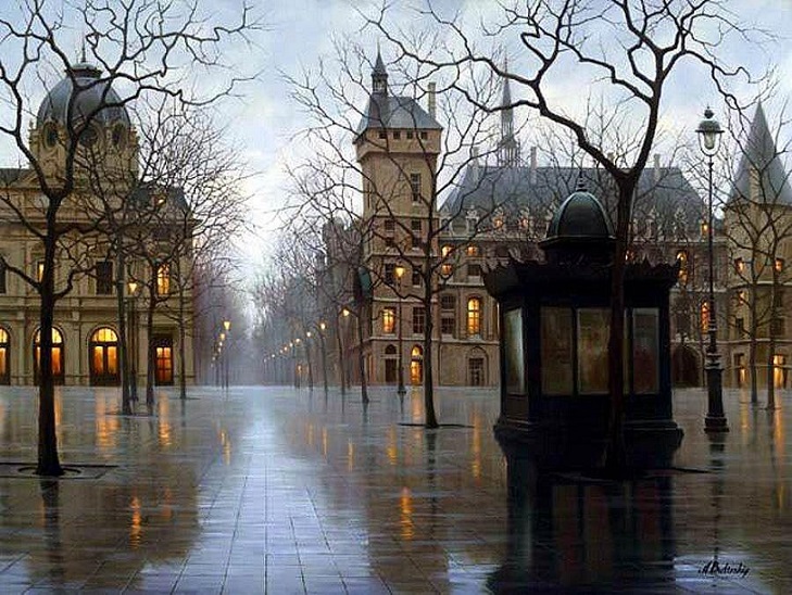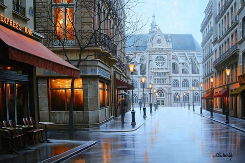 В прошлом году я знакомила Вас с живописью великолепного художника Алексея Бутырского, успешного современника. Алексей родился в Москве в 1974 году. Меня вновь покорили его новые городские картины: удивительная игра света и теней, чувство формы и цвета в картинах создают неповторимое впечатление узнавания, вспоминаешь ту или иную улицу в городах, где я побывала. Крыши городских особняков, мокрые тротуары особенно хороши, кажется, что стоишь рядом на балконе и смотришь на город с высоты... Моё удивление, восхищение, когда я гуляла на улицах, запечатлены с изумительной атмосферностью.