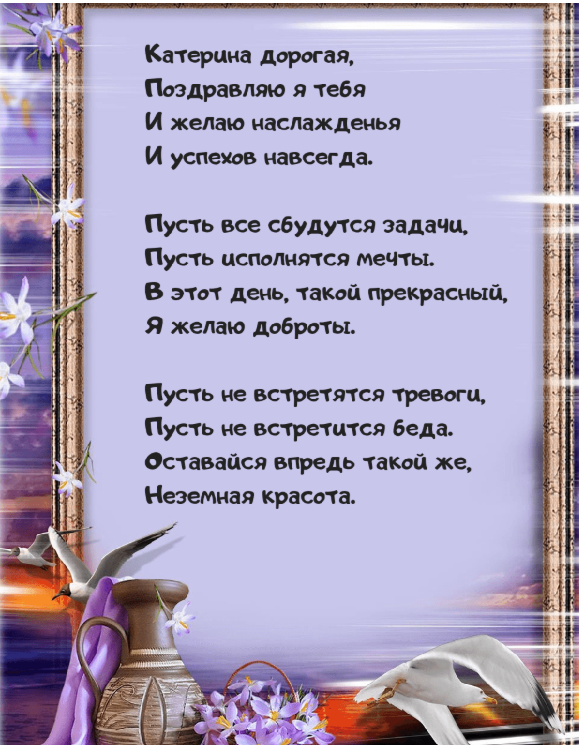 А кто был зачат в апреле, Когда птицы дружно пели, Тот родился в январе, Со стихами в голове. С Днём Рождения, Катюша, Юмор верно тебе служит. Я желаю тебе счастья, Во всём яркого участья. И пусть юмора искринка Будет в жизненной картинке. |