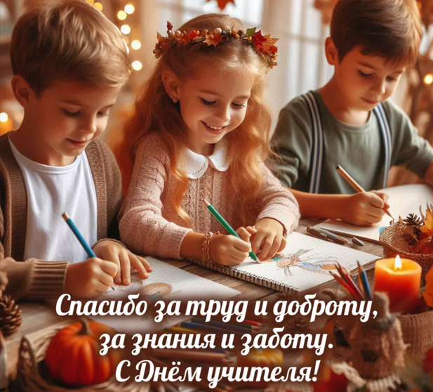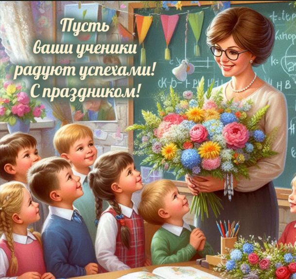 Желаем вам новых педагогических успехов, творческой энергии, ярких талантливых и благодарных учеников, крепкого здоровья, семейного счастья и благополучия! Как много хорошего мы должны сказать нашим учителям, ведь именно они дают необходимые знания нашим детям, а когда-то давали их нам. Сложно переоценить их самоотверженный труд в воспитании подрастающих поколений, повышении образовательного уровня всего нашего социума. И есть такой день, когда каждый может выразить свою признательность, благодарность и глубокое уважение человеку, трудящемуся на благо обществу - учителю.