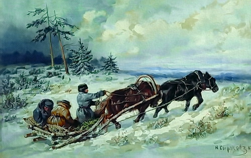 Гонит лошадь ямщик, погоняет.